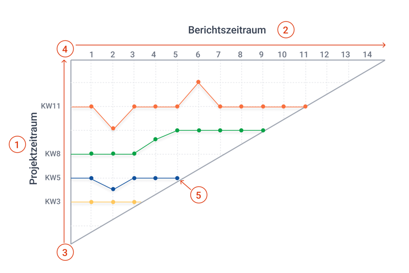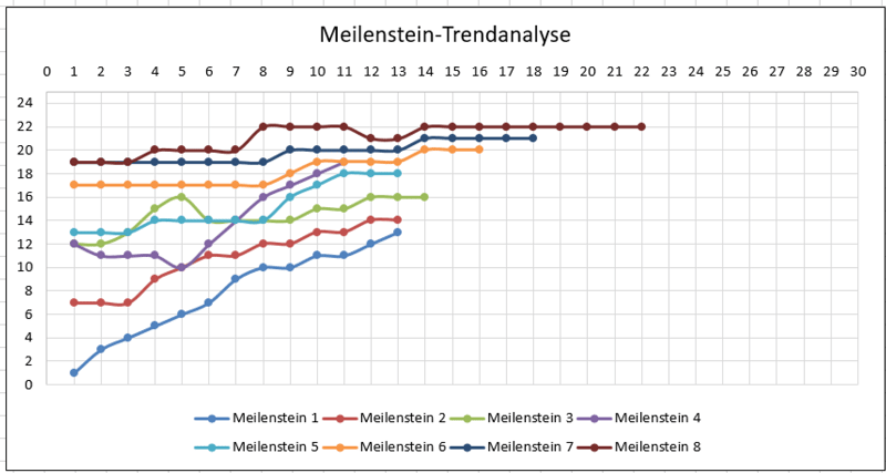 Vereinfacht gesagt: Bei jedem Bericht trägt die Projektleitung ein, wann mit der Fertigstellung des Meilensteins zu rechnen ist. Dieses Vorgehen ist bei jedem Meilenstein dasselbe; das Diagramm wächst mit jedem Eintrag und kann im Projektverlauf so aussehen: