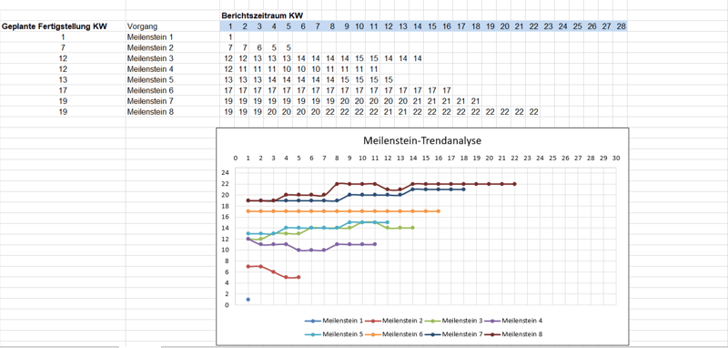 Die Meilensteintrendanalyse ist ein übersichtliches Diagramm, auf dem alle wichtigen Meilensteine eines Projekts eingezeichnet sind.