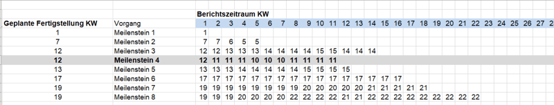 Wie sind die Eintragungen durchzuführen? In unserem Beispiel nehmen wir an, dass der Meilenstein 4 in der Kalenderwoche 12 fertiggestellt wird. Beim ersten Bericht in der KW 1 sind wir weiterhin dieser Überzeugung. Deswegen tragen wir die KW 12 weiterhin als Ziel ein.