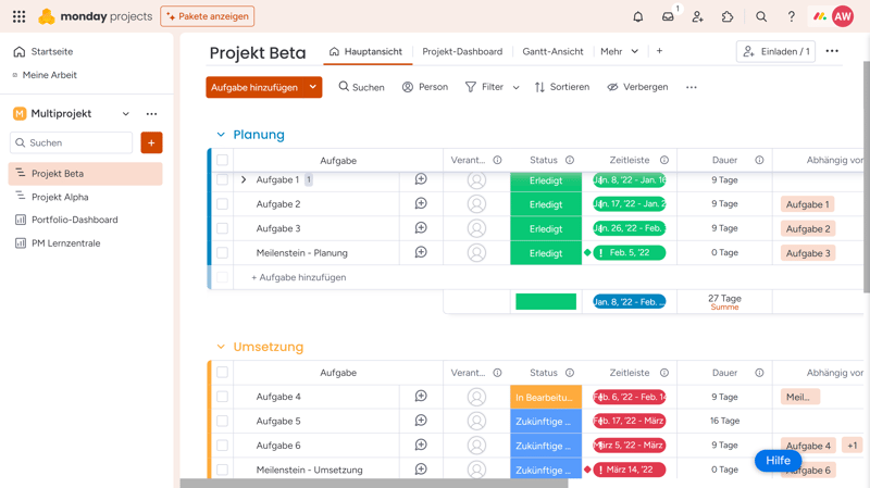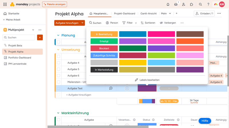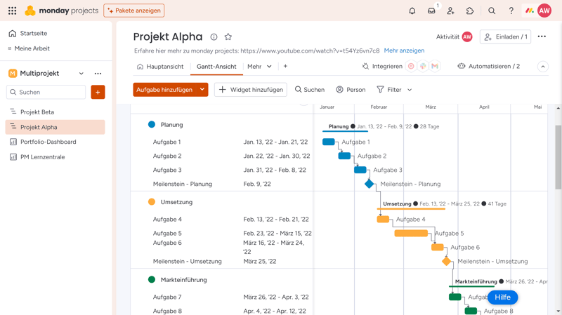 Gantt: Mit der Gantt-Ansicht, die Ihre Aufgaben im zeitlichen Verlauf anzeigt, können Sie auf die Schnelle Projektabhängigkeiten erkennen. Sie sehen auch, welche Aufgaben voneinander abhängig sind und wann bestimmte Meilensteine erreicht werden. Die Ansicht eignet sich zur Visualisierung komplexer Projekte mit vielen Abhängigkeiten, sowie für die Stakeholderkommunikation.