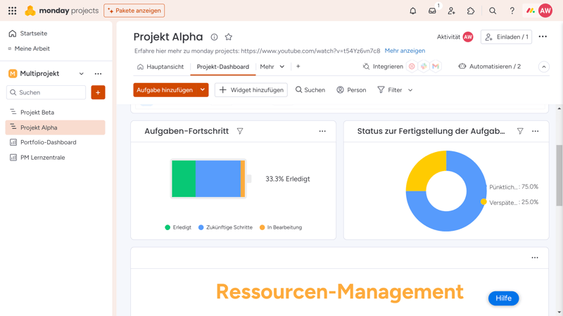 Komplexe und große Projekte profitieren von diesen Dashboards besonders, weil sie wichtige Zahlen, Daten und Fakten auf einen Blick verfügbar machen. Bewegt sich das Projekt derzeit im geplanten Zeitrahmen? Wie viele Aufgaben sind überfällig? Diese Informationen lassen sich ablesen, ohne dass Sie in der Tabelle jedes einzelne Datum prüfen müssen.