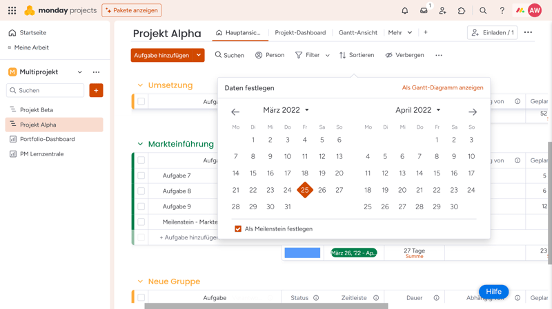 Zeitleiste: Geben Sie an, wann die Aufgabe startet und endet. Hier können Sie auch Meilensteine eintragen, indem Sie keinen Zeitraum, sondern einen Stichtag angeben und anschließend das Häkchen bei „als Meilenstein festlegen“ setzen.