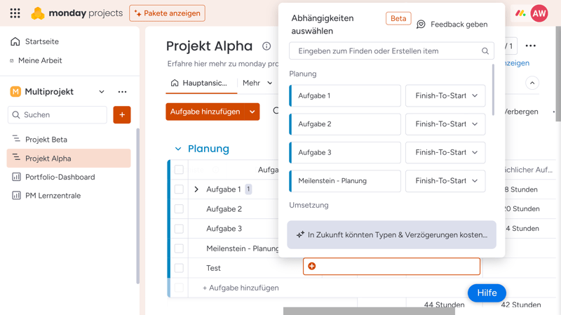 Sie können mehrere Aufgaben auswählen und auch die Art der Abhängigkeit bestimmen
