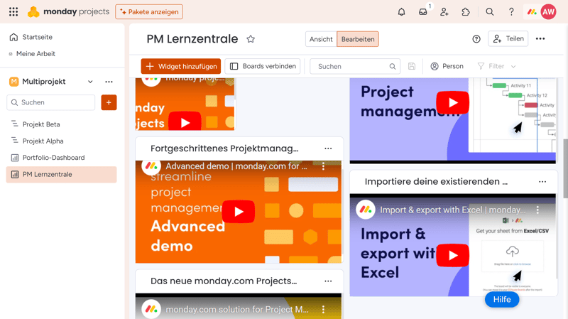 Auch bei den Support-Inhalten klotzt monday.com, statt zu kleckern, und unterstützt Nutzer beispielsweise mit Erklärvideos in der hervorragend ausgestatteten PM-Lernzentrale: