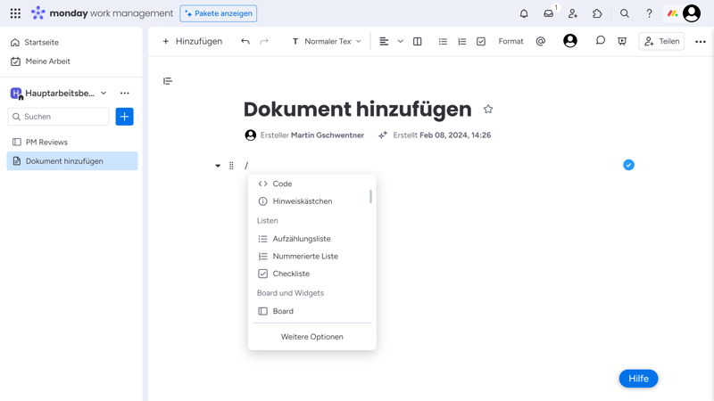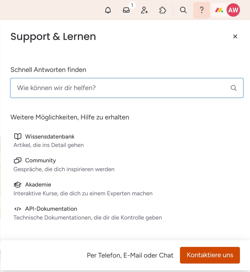 Ein Hilfebereich ist aber auch direkt in die monday-Benutzeroberfläche eingebaut: Wenn Sie oben rechts auf das Fragezeichen klicken, können Sie Hilfeartikel schnell durchsuchen, Support-Inhalte wie die Wissensdatenbank aufrufen oder die Kontaktmöglichkeiten öffnen.