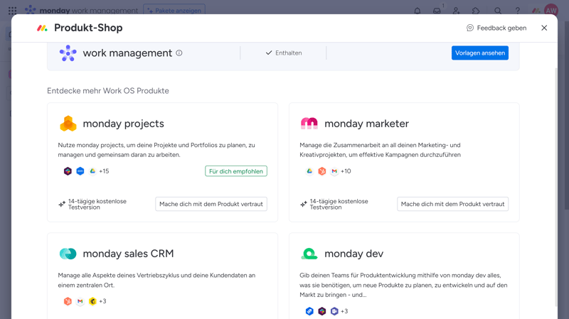 monday.com bietet verschiedene Produkte an, die Sie wie einzelne Module aktivieren oder deaktivieren können. Zu Beginn ist das Produkt Work Management aktiv, das die wichtigsten Projektmanagement-Funktionen umfasst.