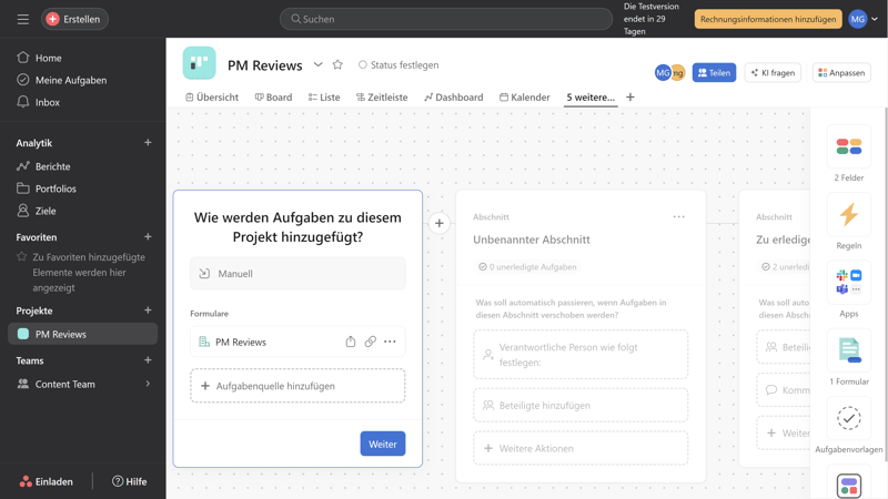 Asana ist stärker prozessorientiert als andere Plattformen – egal ob Notion, ClickUp oder monday.com. Workflows und Aufgabenabfolgen werden bei Asana besonders dynamisch abgebildet.Intuitive Automatisierungen