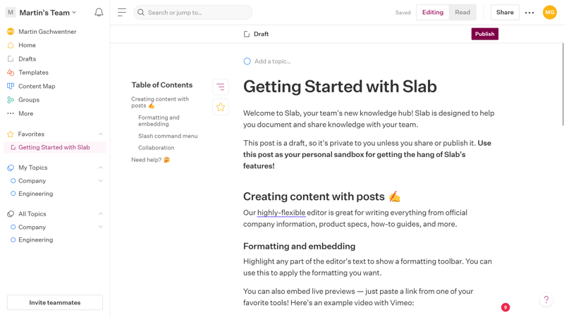 Genau wie Slite versucht Slab nicht, zu viele Hüte auf einmal zu tragen. Die Wissensmanagement-Plattform ist darauf ausgelegt, Teams dabei zu helfen, ihr kollektives Wissen effektiv zu organisieren und zu teilen.