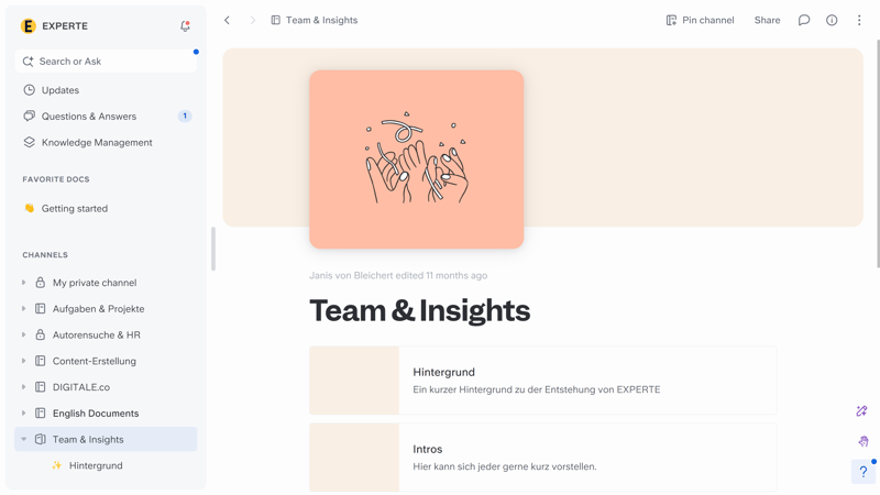 Slite punktet mit einer einfachen und klar strukturierten Benutzeroberfläche, in der sich auch neue Benutzer schnell zurechtfinden sollten. Die Möglichkeit, Inhalte in Kanälen zu organisieren und Informationen thematisch zu gruppieren, sorgt für Ordnung innerhalb der Plattform und gibt Teammitgliedern einen zentralen, übersichtlichen Einblick in alle für sie relevanten Bereiche.