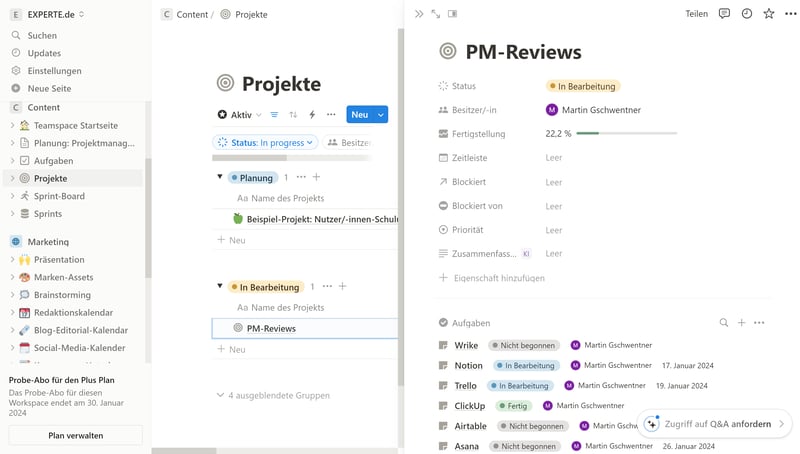 Besonders funktionsstark sind die Gratis-Versionen von ClickUp, Asana, Notion und Airtable. Auch wenn Sie auf die eine oder andere Ansicht oder Einstellung verzichten und so manche Limits hinnehmen müssen, handelt es sich selbst bei den Gratis-Tools um vollwertige Programme, mit denen Sie Ihre Projekte und Aufgaben umfassend planen und organisieren können.