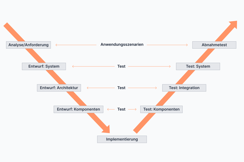 Das V-Modell nimmt einen besonderen Platz unter den Phasenmodellen ein, denn es wurde speziell für Softwareprojekte entwickelt. Die Phasen sind so aufgebaut, dass die Projektteams in einer Phase nicht nur die vorgesehenen Ergebnisse, sondern auch die benötigten Tests zur Prüfung dieser Ergebnisse erstellen.