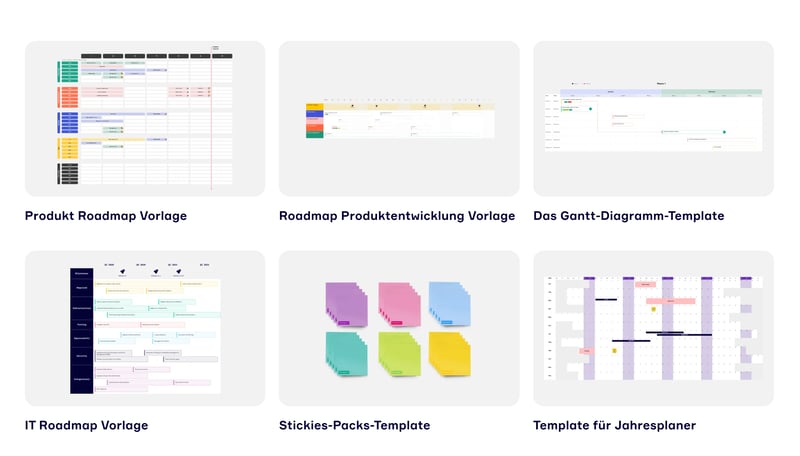 Miro: Mit Miro können Sie nicht nur eine Roadmap erstellen, sondern auch Ideen sammeln und Workshops durchführen. Denn Sie profitieren von der Möglichkeit, in Echtzeit zusammenzuarbeiten und Remote-Teams bei der Erstellung zu unterstützen. Das Tool bietet auch zahlreiche andere Vorlagen.
