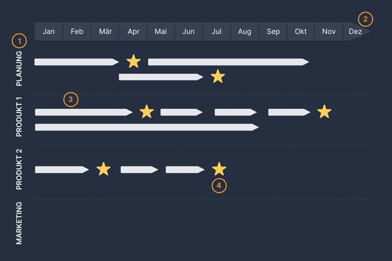 Swimlane: Die Swimlane ist eine visuelle Darstellung in Diagrammen, die dazu dient, Aufgaben, Prozesse oder Verantwortlichkeiten innerhalb spezifischer Bereiche oder Kategorien zu organisieren und abzugrenzen. Bei der Roadmap kann sie, muss aber nicht enthalten sein. Sie bietet die Option, Informationen aufzuzeigen und zu organisieren. Sie können etwa nach Projekten, Abteilungen, nach Ressourcen oder Phasen unterteilen und so nachfolgende Inhalte übersichtlich zuordnen.