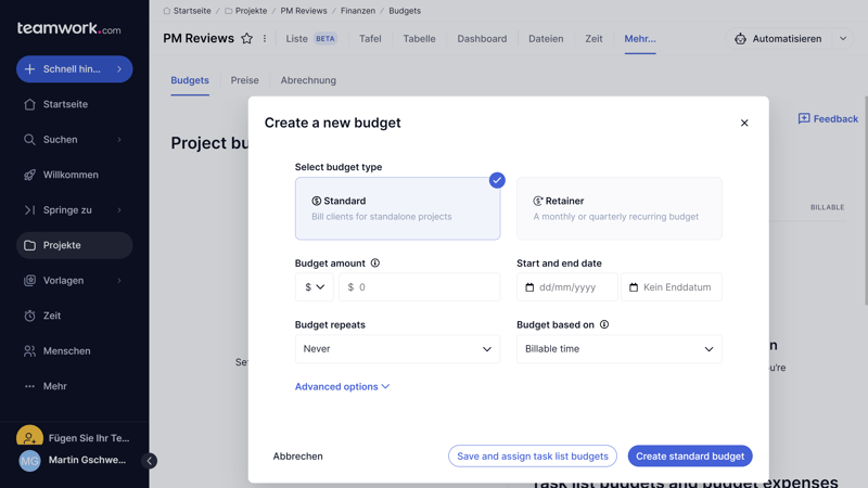 Weiterhin können Sie jedem Projekt ein Budget zuweisen und auswählen, ob die dafür verwendeten Stunden abrechenbar sind oder nicht.