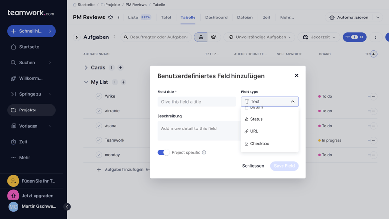 Aufgaben innerhalb von Projekten lassen sich vielseitig anpassen, doch die Auswahl an benutzerdefinierten Feldern könnte größer sein.