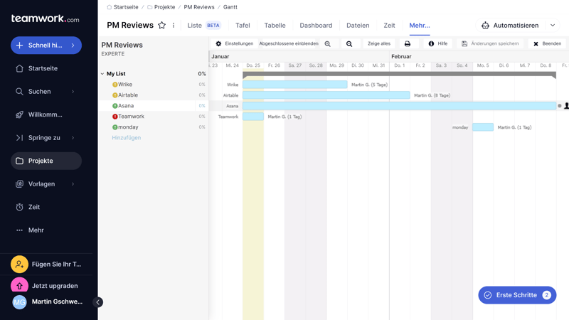Gantt: Die Gantt-Ansicht zeigt Ihre Aufgaben in Balkenform auf einer Zeitleiste. So können Sie schnell einsehen, wer wann wie ausgelastet ist.