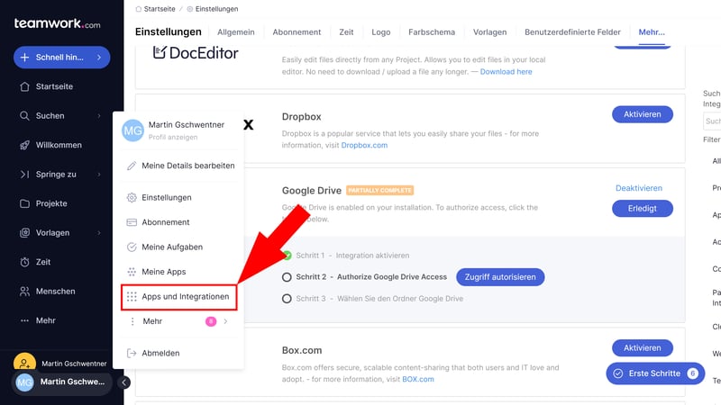 Neben den Teamwork-eigenen Anwendungen bietet die Plattform natürlich auch Integrationen und Schnittstellen zu vielen anderen Programmen. Sie finden einige davon im Admin-Bereich unter „Apps und Integrationen“, andere können Sie in Ihrem Profil im Tab „Anwendungen“ einrichten.