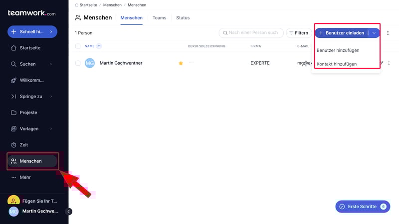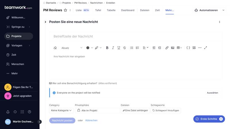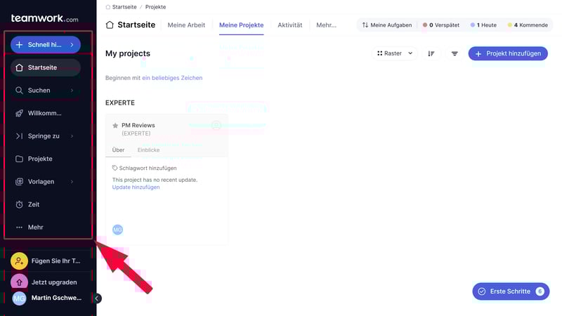 Im Teamwork-Dashboard ist auf den ersten Blick ziemlich viel los. Machen Sie sich also zunächst mit der Struktur und den Bedienelementen der Plattform vertraut, denn die Bereiche und Funktionen sind logisch unterteilt.