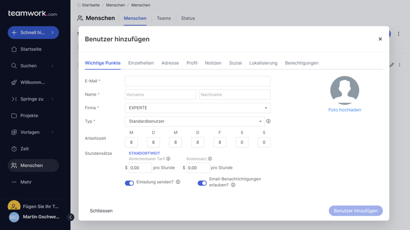 Sie können verschiedene Nutzertypen (Mitarbeitende oder Kunden) einladen und gemeinsam an Projekten arbeiten; Echtzeit-Kollaboration ist durch Upgrades möglich.Eingebaute Budget- und Rechnungsfunktionen