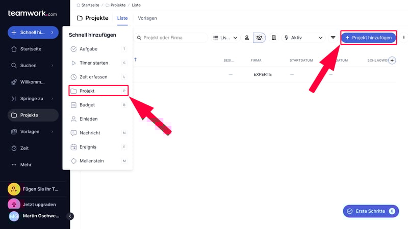 Um ein neues Projekt anzulegen, klicken Sie in einem dieser Bereiche auf den „Projekt hinzufügen“-Button oder wählen Sie die entsprechende Aktion im „Schnell hinzufügen“-Menü aus.