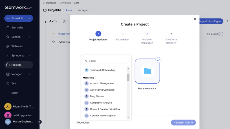 Sie könne Projekte entweder manuell oder aus einem Template erstellen. Die Auswahl an Vorlagen ist groß und in verschiedene Kategorien (z. B. Marketing, IT, Projektmanagement) unterteilt. Unter anderem gibt es Templates für die Planung von Werbekampagnen, Redaktionskalender oder agile Softwareentwicklung.