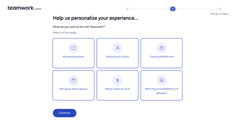 Die ersten Schritte sind bei Teamwork.com schnell getan. Zunächst müssen Sie ein paar Fragen zu Ihrem Unternehmen und Ihrer Rolle beantworten.