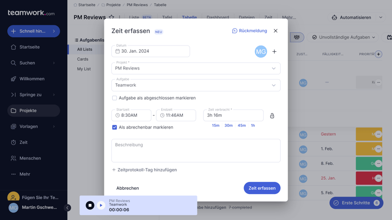 Links finden Sie das Haupt-Navigationsmenü. Hier erreichen Sie die unterschiedlichen Features und Funktionsbereiche von Teamwork.com. Über den „Schnell hinzufügen“-Button können Sie einige Aktionen ohne Umschweife ausführen – beispielsweise eine neue Aufgabe erstellen oder die Zeit für ein Projekt erfassen.