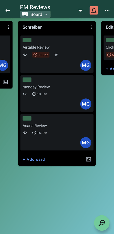 Board: In der bereits erwähnten Standard-Board-Ansicht, die auf dem Kanban-Prinzip basiert, können Sie den Projektfortschritt mit seinen verschiedenen Etappen im Blick behalten. Sie ist ideal für die allgemeine Projektplanung, die Erstellung von Content-, Vertriebs- oder anderen Pipelines, und als Informationsquelle für Ihr Team.