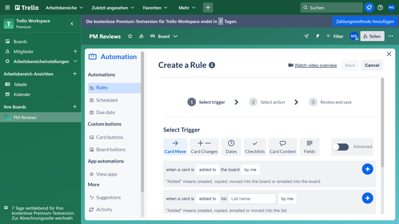 Viele Funktionen, die von Trellos Bordmitteln nicht abgedeckt werden, beispielsweise Abhängigkeiten zwischen Aufgaben, können Sie sich mit Automatisierungen also selbst zusammenbauen.