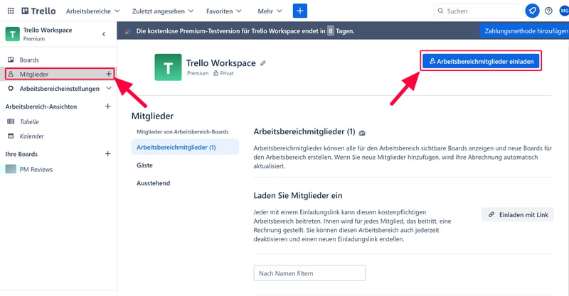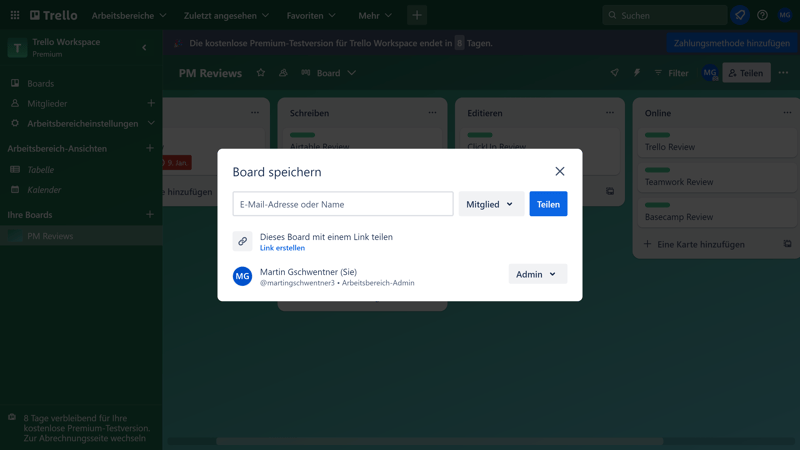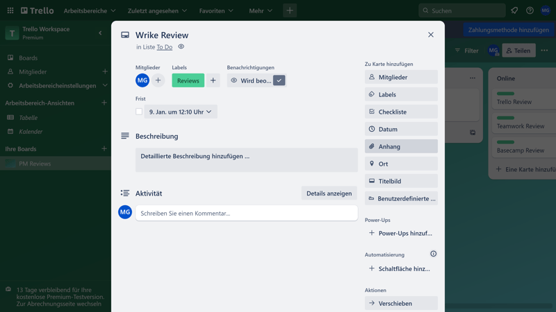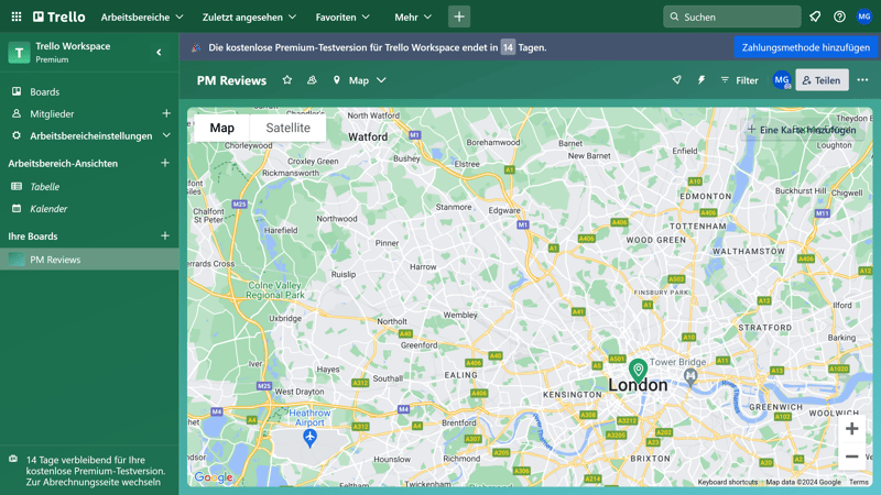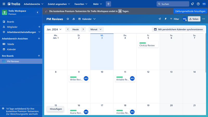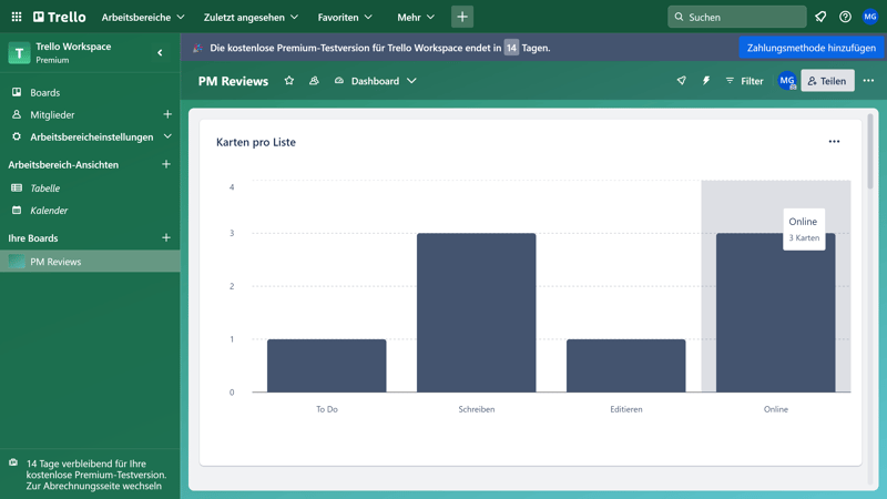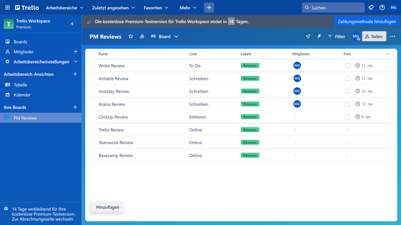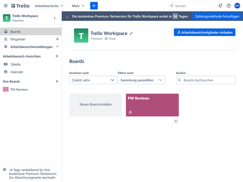Sie können die Premium-Tarife von Trello 14 Tage kostenlos testen.