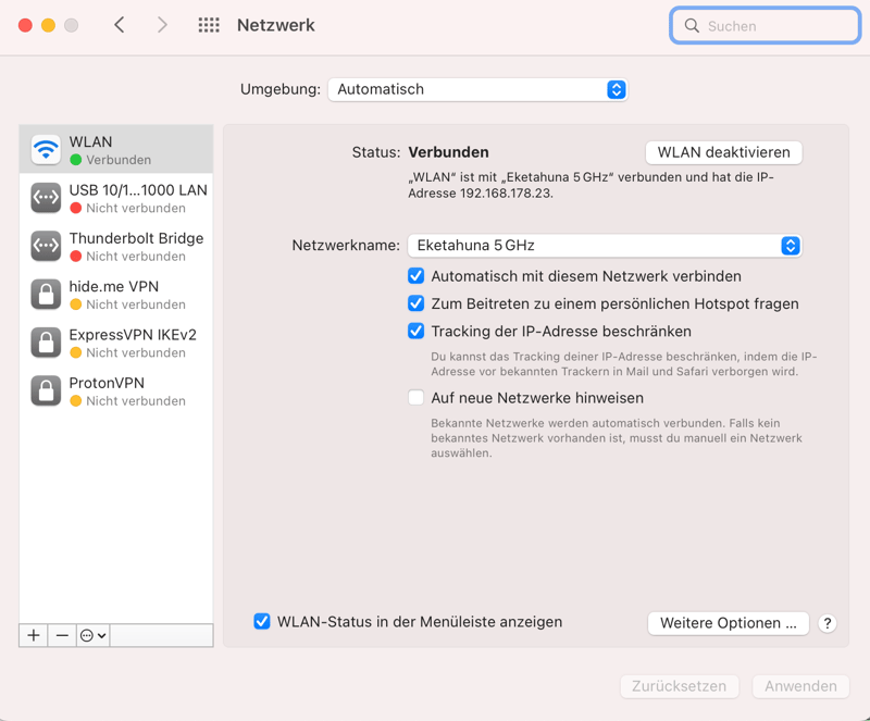 5. Nun ist die Proxy-Verbindung eingerichtet, allerdings nur für das ausgewählte Netzwerk.