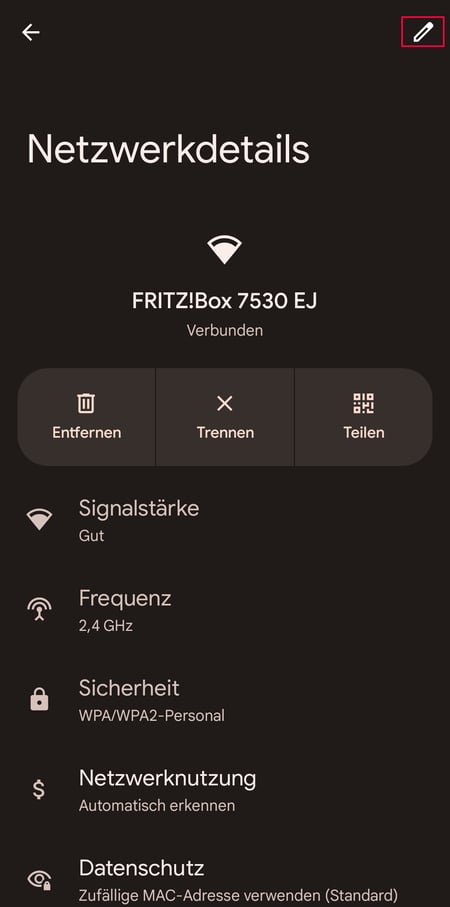 2. Tippen Sie nun auf das Netzwerk, für das Sie die Proxy-Verbindung einrichten möchten, um die Netzwerkdetails zu öffnen. Tippen Sie auf das Bleistiftsymbol oben rechts, um die Einstellungen aufzurufen.