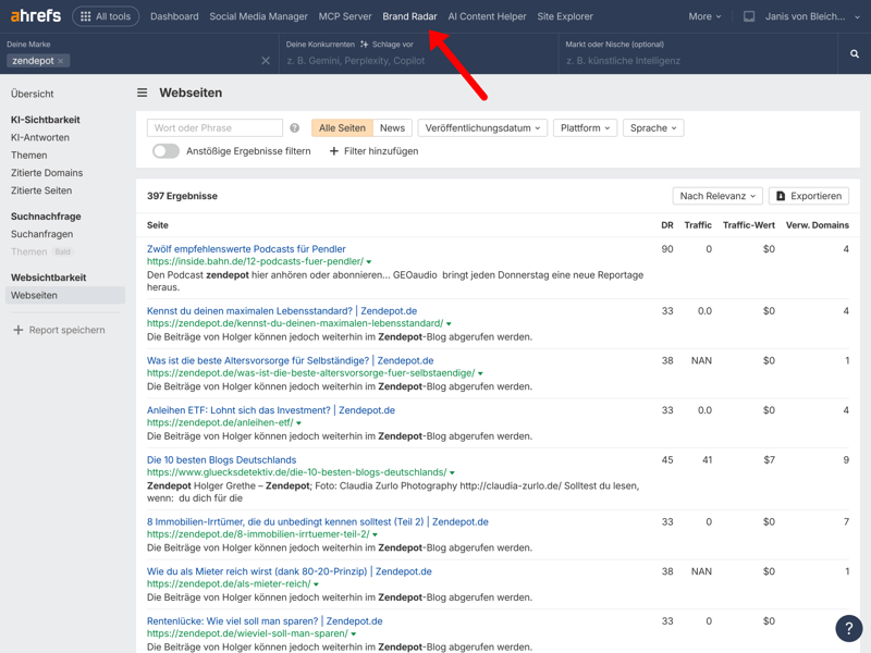 Bei Ahrefs finden Sie die Erwähnungen im Feature „Brand Radar“. Hier lassen sich neben dem Markennamen auch Produktpalette, Konkurrenz, Märkte und mehr untersuchen: