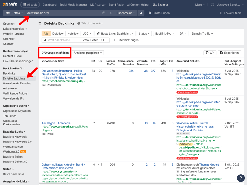 Beispiel einer Broken-Link-Analyse von der Domain von Wikipedia