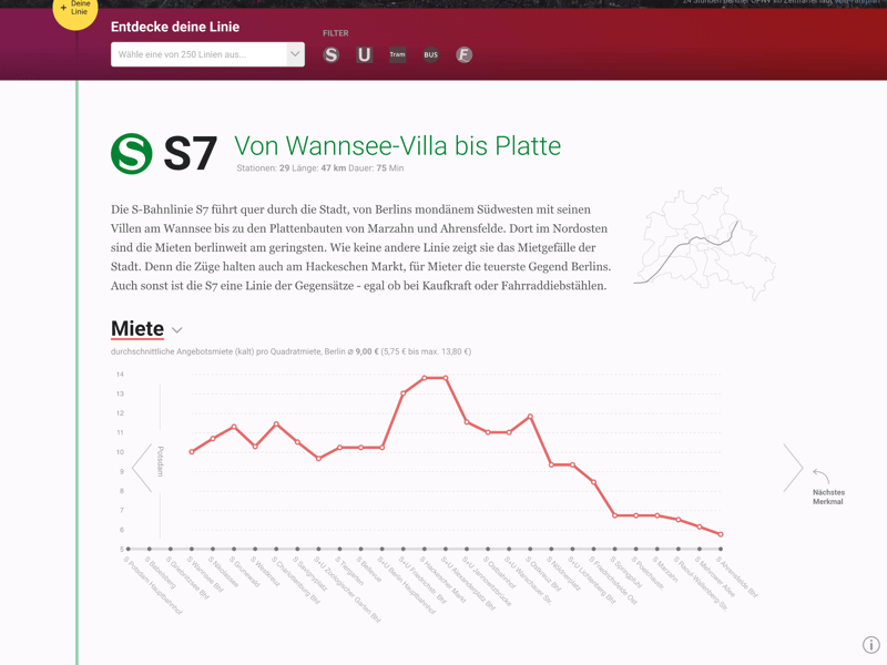 Ein sehr anschauliches Beispiel ist der „Haltestellen-Check“ der Berliner Morgenpost. Hier können Sie virtuell entlang der Berliner S-Bahn-Linien fahren und sich an jeder Station demografische Daten und Mietpreise anzeigen lassen. Der praktische Nutzen liegt in den vielfältigen Filtermöglichkeiten und der klaren, visuellen Darstellung: Das Storytelling entsteht durch die interaktive Fahrt durch die Stadt.