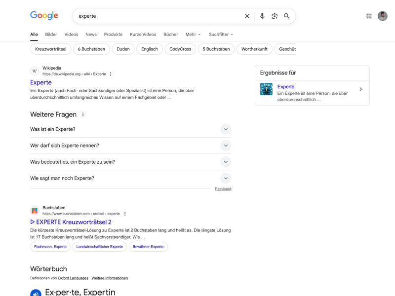 Bei der Suchanfrage „experte“ sehen Sie diese beiden Top-Ergebnisse des Google-Rankings.