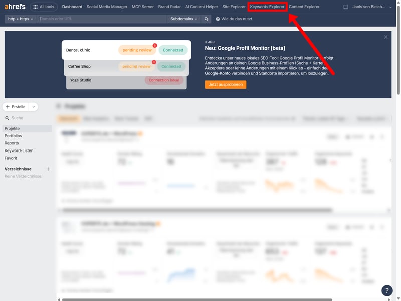 Öffnen Sie in der oberen Menüleiste den Keywords Explorer in Ahrefs.