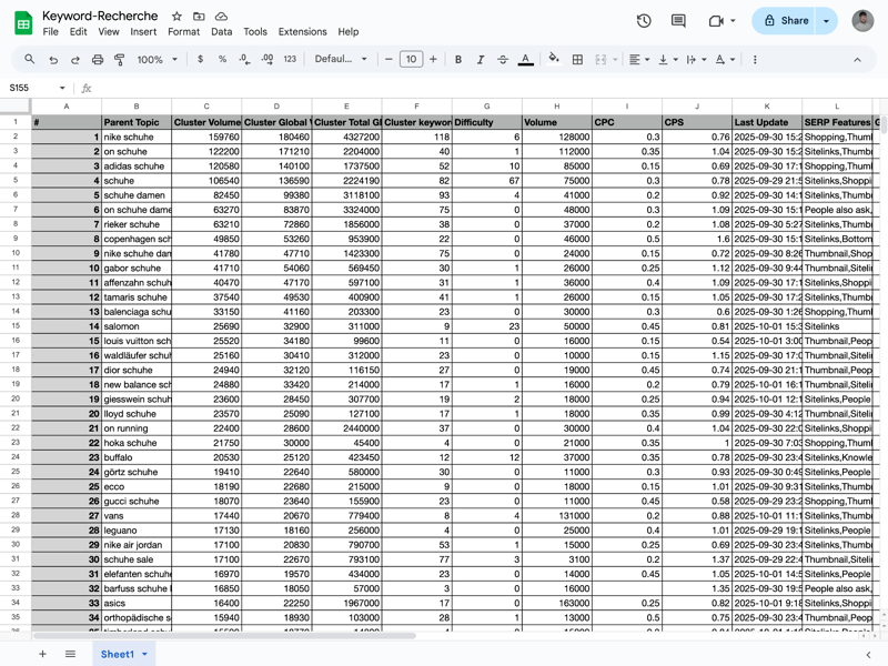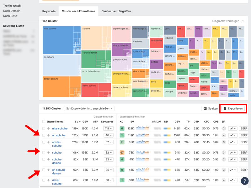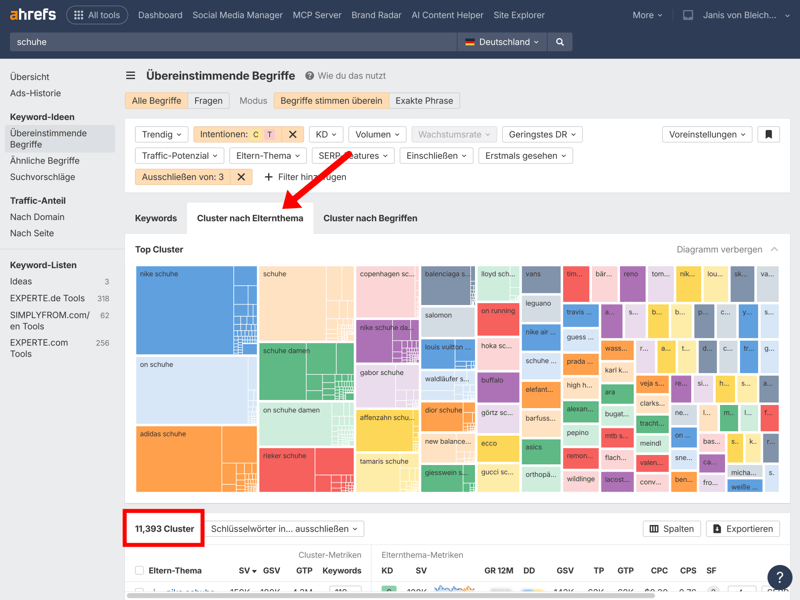 Das Ziel: Für jeden Cluster soll später eine eigene, inhaltlich umfassende Seite entstehen. So vermeiden Sie sogenannten Keyword-Kannibalismus – also den Fall, dass mehrere Seiten Ihrer Website für dasselbe Keyword konkurrieren und sich gegenseitig die Rankings streitig machen.