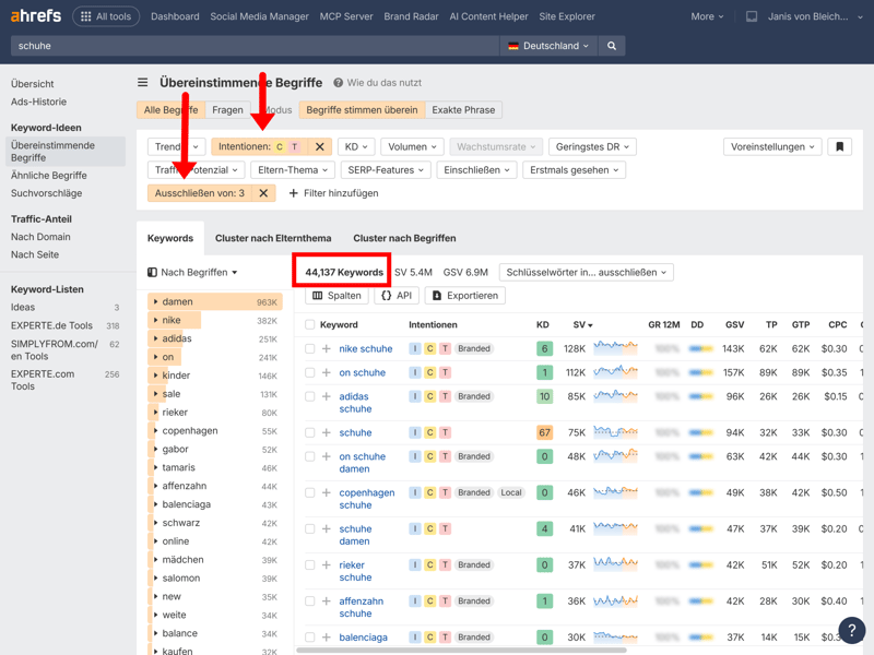 Sie können weitere Filter nutzen, um gewisse Schlüsselbegriffe explizit herauszufiltern. In unserem Beispiel sind alle Keywords mit „herren“, „deichmann“ und „puma“ zu vernachlässigen, da wir diese nicht im Angebot haben bzw. diese unsere direkten Shop-Konkurrenten sind.