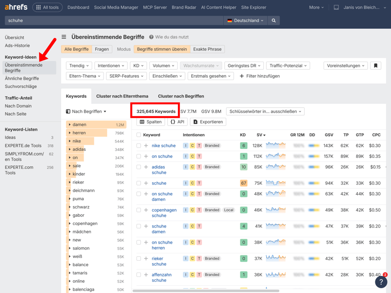 In der Ansicht „Übereinstimmende Begriffe“ finden Sie alle möglichen Keywords (>300.000).