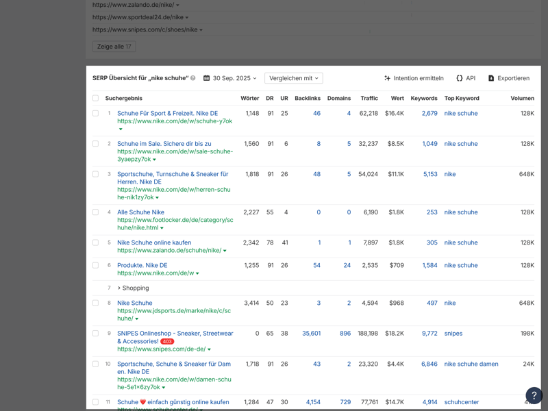Konzentrieren wir uns auf die spezifischen SERPs (hier von „nike schuhe“) um zu priorisieren.