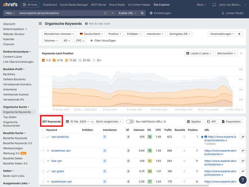 Während das Suchvolumen oft nur für einen einzelnen Begriff angegeben wird, beschreibt das Traffic-Potenzial die Summe der Chancen aus einem ganzen Themenbereich. Der Artikel „VPN kostenlos“ auf EXPERTE rankt zum Beispiel auf insgesamt 307 Keywords, woraus sich sein Traffic ergibt: