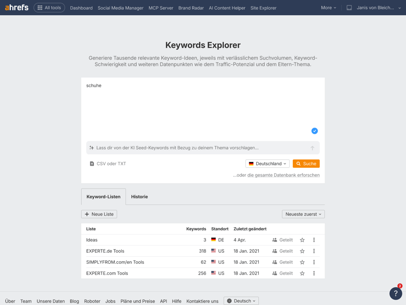 Wir benötigen für die Analyse eine umfassende All-in-One SEO-Suite. Für die Keyword-Recherche ist Ahrefs dabei besonders hilfreich. Das Tool verfügt über eine der größten Keyword-Datenbanken am Markt, liefert präzise Metriken und hat viele wertvolle Zusatzfunktionen integriert. Im folgenden Praxisteil gehen wir die Suche einzeln durch, damit Sie SEO-Keywords finden.