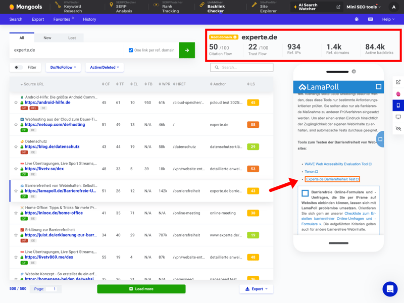 Backlinks lassen sich schneller bewerten als bei vielen Konkurrenten. Mangools zeigt die verlinkende Seite in einer Vorschau und hebt den Ankertext automatisch hervor – der Kontext wird sofort klar.