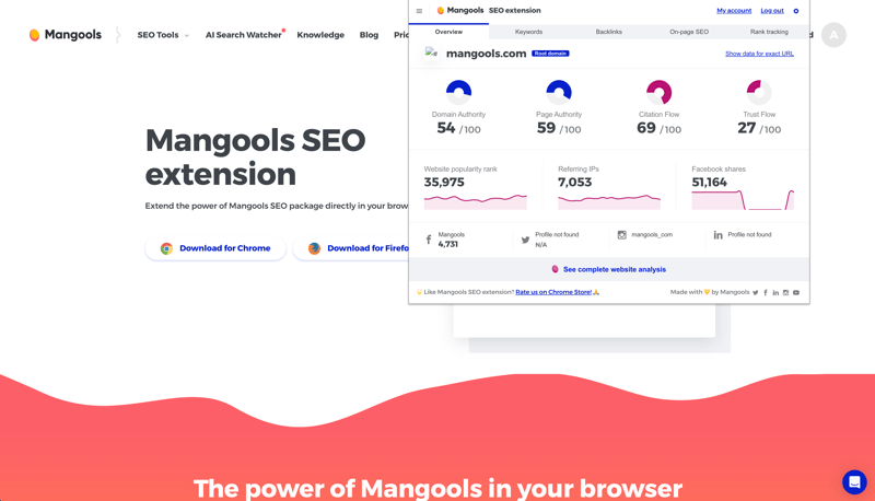 Ein echtes Plus ist die Browser-Erweiterung für Chrome und Firefox. Sie bindet die Daten von Mangools direkt in den Browser ein und ermöglicht schnelle SEO-Checks ohne Umweg über das Haupttool. Ein Klick genügt, um die wichtigsten Kennzahlen zur aktuell geöffneten Website abzurufen.