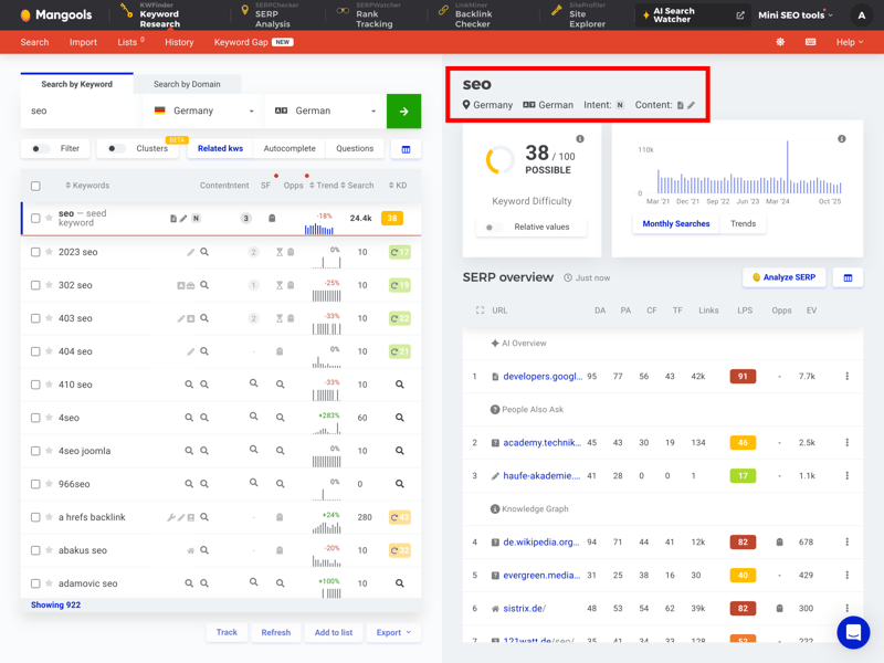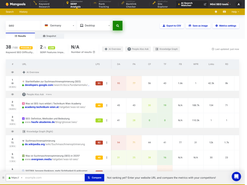 Wechseln Sie hingegen in den SERPChecker und geben dort ein Keyword wie „seo“ ein, zeigt Mangools sofort, welche Domains die Top-Positionen belegen – und liefert Hinweise darauf, warum das so ist.