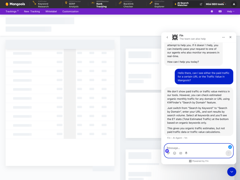 Mangools hilft dank Chatbot direkt bei Fragen zu Funktionen und Inhalten.