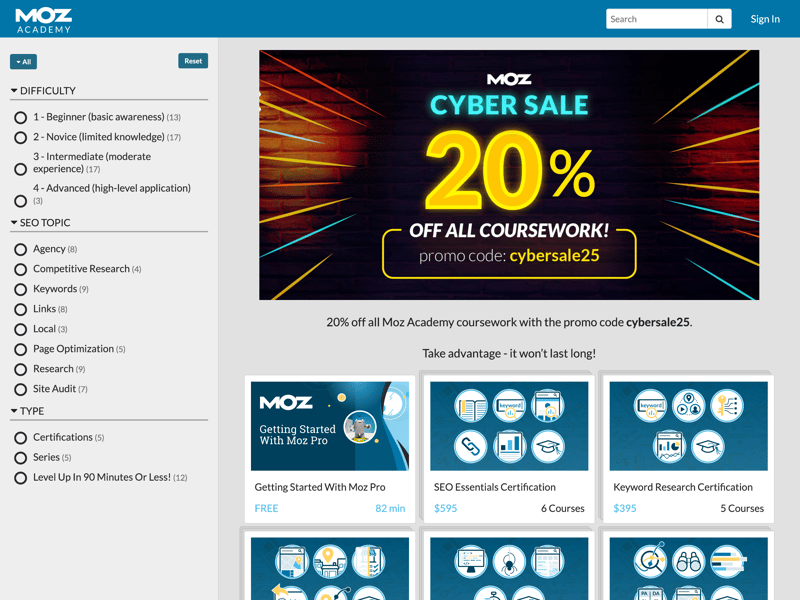 In der Moz Academy finden Sie viele Lerninhalte, sortiert nach Niveau, Thema und Typ.