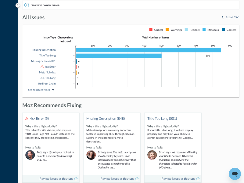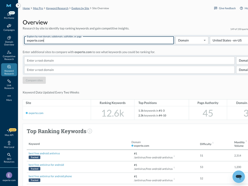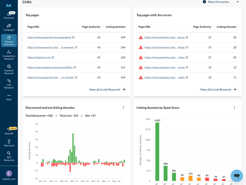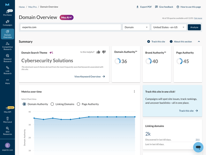 Moz Pro ist nicht gerade das zugänglichste SEO-Tool auf dem Markt. Das Dashboard ist mit komplexen Daten überfrachtet und die Wege zu Funktionen sind nicht immer intuitiv – besonders für SEO-Anfänger:innen. Zudem ist Moz Pro ausschließlich auf Englisch verfügbar, und viele Daten sind (wenn verfügbar) auf die Märkte USA, UK, Kanada und Australien ausgerichtet.