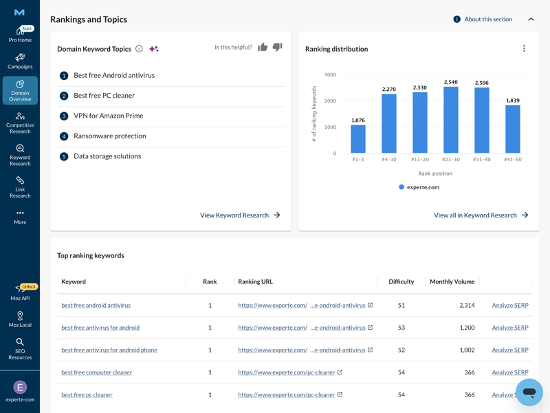 Die Benutzeroberfläche von Moz Pro wirkt aufgeräumt und visuell sauber, die Bedienung ist aber nicht immer so intuitiv wie bei anderen Tools. Zudem erfordert das Dashboard ein gewisses Verständnis für abstrakte Metriken, was gerade für SEO-Einsteiger:innen eine Hürde sein dürfte. Insgesamt lässt sich Moz Pro solide bedienen, verlangt aber Einarbeitung und Geduld.